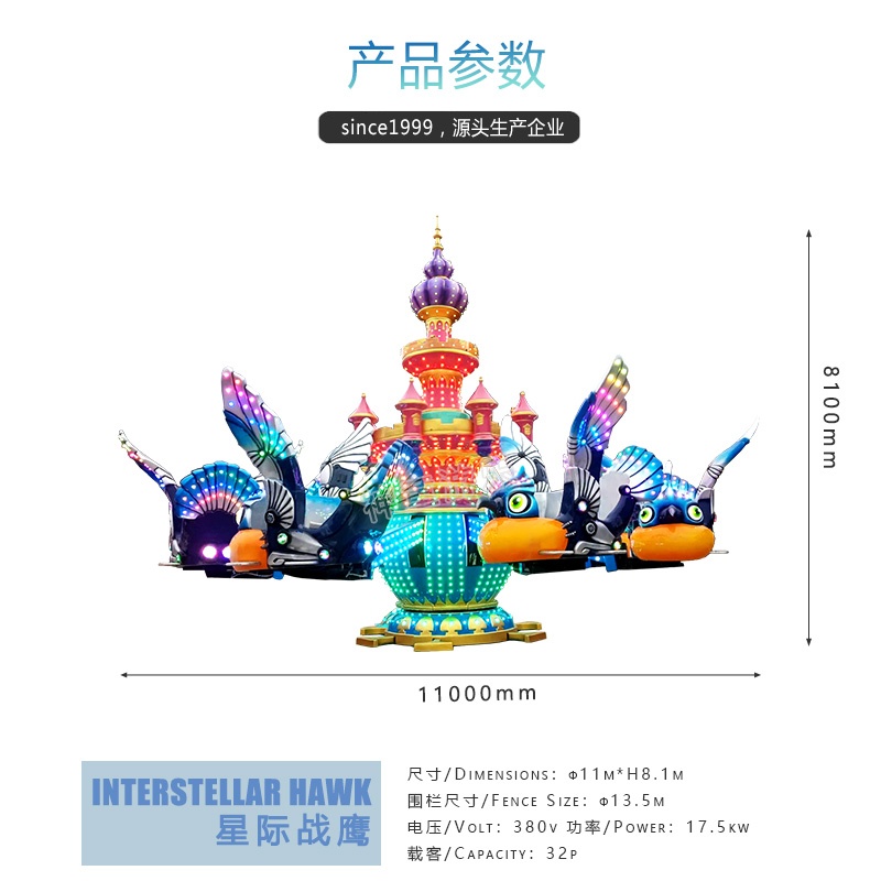 新穎靚麗的造型,華麗迷人的彩燈裝飾,花樣百出的運(yùn)行方式,趣味互動(dòng)的玩法,逼真刺激的空戰(zhàn)音響效果,無(wú)不刺激著玩家的神經(jīng),這是一款不可多得的游樂(lè)場(chǎng)設(shè)施。