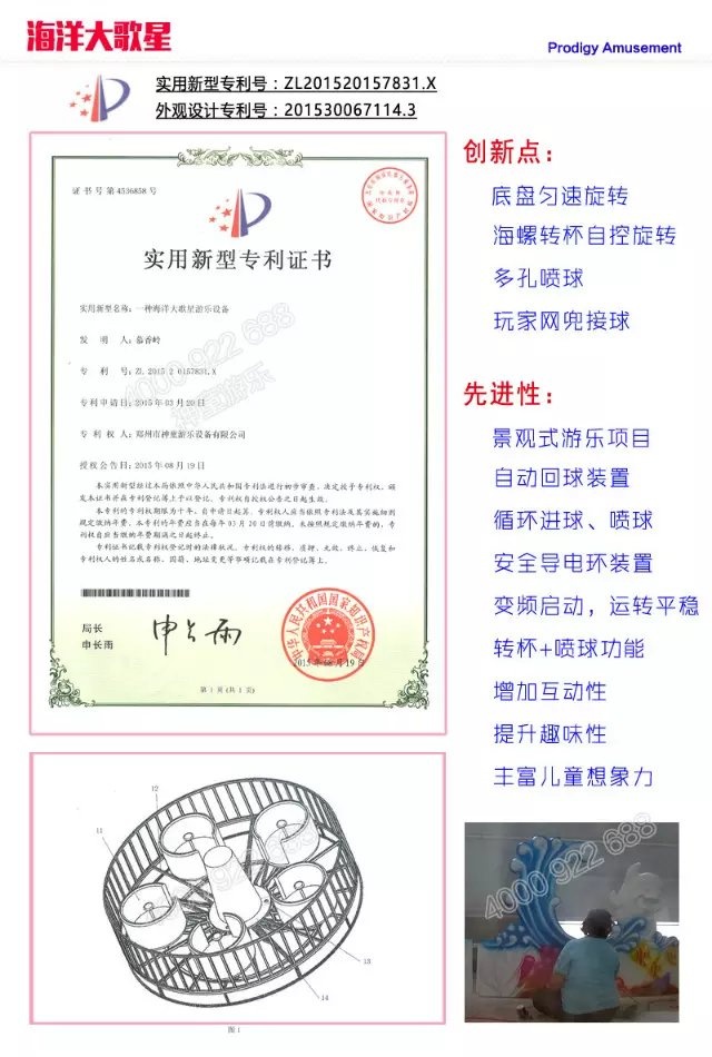 產(chǎn)品優(yōu)勢: 此產(chǎn)品造型新穎,獨(dú)一無二,性價(jià)比高,穩(wěn)定性強(qiáng),適用群體廣泛,操作方便! 底盤勻速轉(zhuǎn)動(dòng),海螺轉(zhuǎn)杯自控旋轉(zhuǎn),多孔噴球,玩家網(wǎng)兜接球。更擁有實(shí)用新型和外觀設(shè)計(jì)專利,轉(zhuǎn)杯+噴球功能的定位,不僅外觀大氣精美,燈光絢麗魔幻,實(shí)在是歡樂噴球車中的精品。