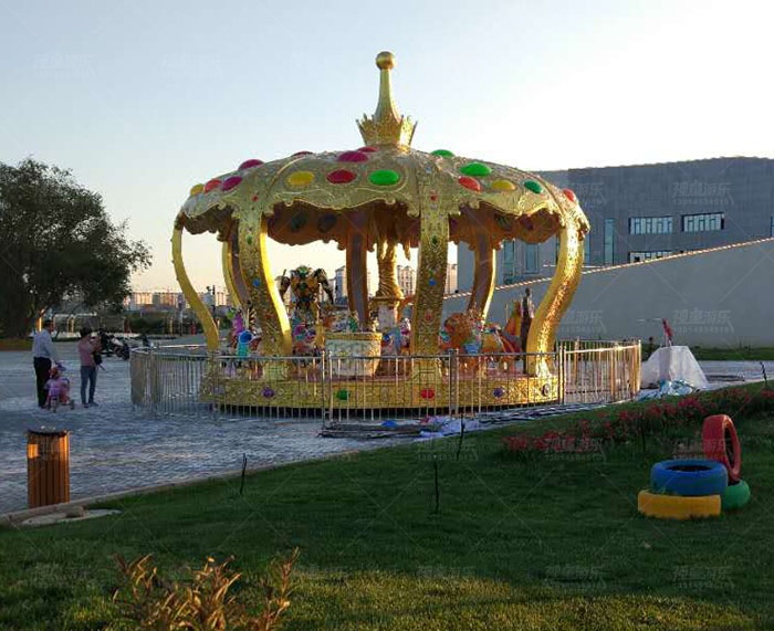 皇冠戰(zhàn)馬是由鄭州神童游樂(lè)設(shè)備開(kāi)發(fā)研制的新一代大型豪華轉(zhuǎn)馬游樂(lè)設(shè)施。轉(zhuǎn)馬既能繞垂直主軸旋轉(zhuǎn),又能上下起伏的游樂(lè)機(jī)械。新型的全齒輪傳動(dòng)、安全變頻啟動(dòng),設(shè)計(jì)新穎、機(jī)構(gòu)獨(dú)特、造型美觀。設(shè)備啟動(dòng)后,當(dāng)乘客坐在豪華轉(zhuǎn)馬里,七彩斑斕的鉆石燈光閃閃發(fā)光,金色銀色相互輝映,各種色彩的馬匹、王座競(jìng)相奔跑,猶如萬(wàn)馬奔騰的熱烈場(chǎng)面。