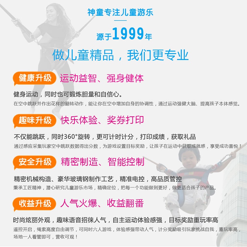 糖果飛人旋轉(zhuǎn)蹦床是通過蹦蹦跳跳的方式獲取快樂、獲取禮品,在全民健身、全民運動的社會大背景下,不僅適合學(xué)業(yè)負擔(dān)重、運動量少的孩子, 更符合工作壓力大、長期久坐的上班族;本產(chǎn)品是他們?nèi)の督∩淼牟欢x,玩家在空中跳躍或者翻滾,更能增加他們身體的協(xié)調(diào)性,通過運動強健大腦,釋放壓力,提高他們本體感覺。