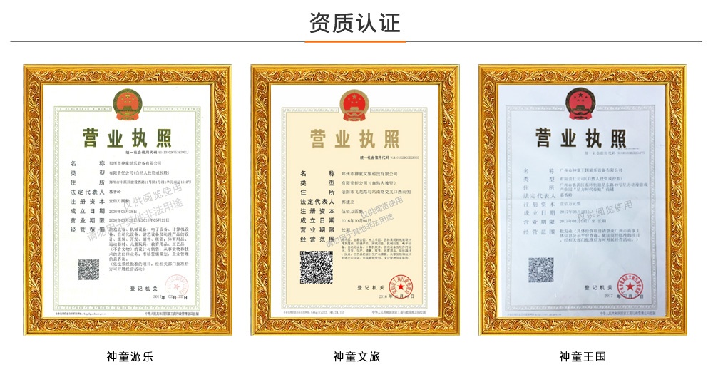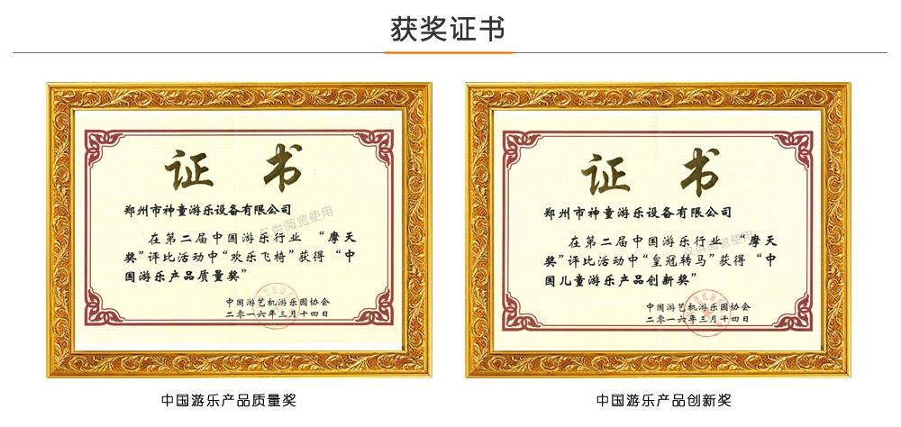 神童游樂專注兒童游樂行業(yè)20年,得到中國游樂行業(yè)及各大權(quán)威機構(gòu)的一致認可,先后獲得ISO9001;2000國際質(zhì)量體系認證、ISO環(huán)境管理認證、ISO質(zhì)量管理認證、ISO安全管理認證、歐洲質(zhì)量認證中心CE認證、中國游樂產(chǎn)品質(zhì)量獎、中國游樂設備產(chǎn)品創(chuàng)新獎,中國游藝機游樂園協(xié)會會員單位、國際游藝機IAAPA會員單位、游樂設備ZZAEA副會長單位、動漫游藝行業(yè)GAGA會員單位,河南省重質(zhì)量守信譽誠信聯(lián)盟理事單位,慧聰網(wǎng)優(yōu)質(zhì)供貨商,并取得外觀設計專利及實用新型專利等多項產(chǎn)品技術(shù)專利。