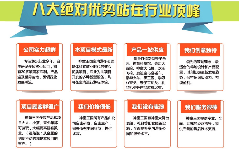 神童模式:神童有超強(qiáng)的策劃團(tuán)隊(duì),全國多家實(shí)體店實(shí)戰(zhàn)經(jīng)驗(yàn),專業(yè)、全面、系統(tǒng)的游樂場經(jīng)營指導(dǎo)、管理、更多新產(chǎn)品的持續(xù)支持。保持場地持續(xù)盈利的系統(tǒng)化營銷方案,會(huì)員活動(dòng)全國同步,直營經(jīng)驗(yàn)即時(shí)分享。